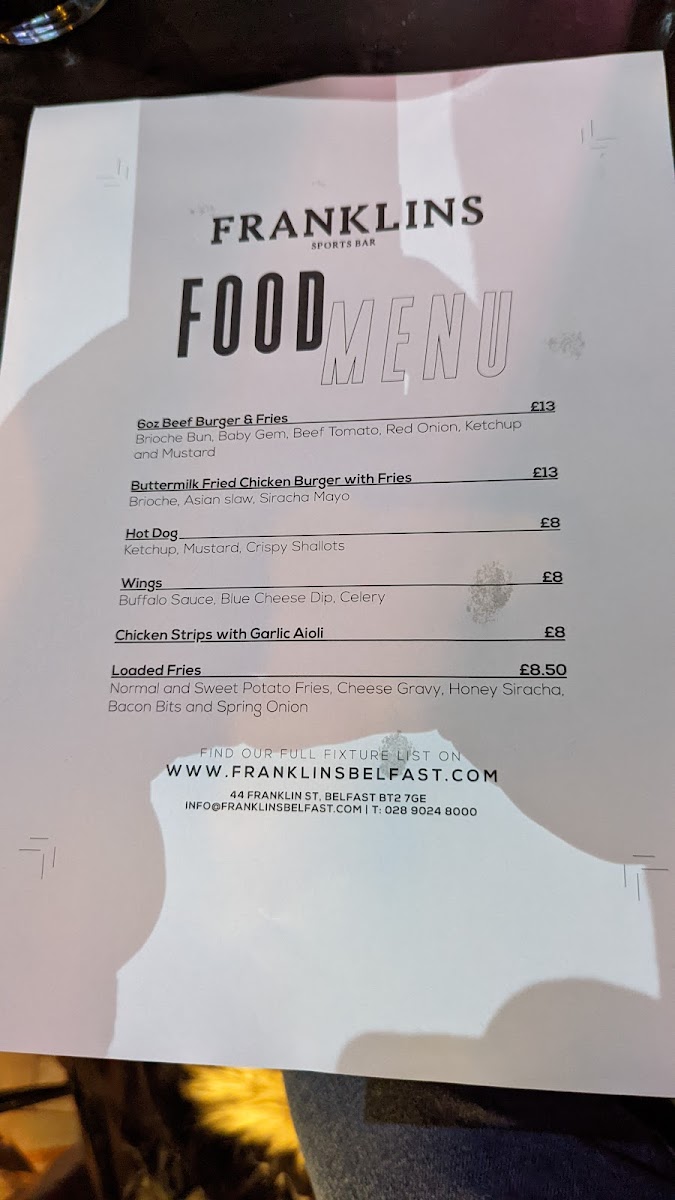 Franklin's Sports Bar, located at 43 Franklin St, Belfast BT2 7FE, United Kingdom, offers a delightful experience for both sports enthusiasts and casual diners alike. Its diverse Franklin's Sports Bar Menu is an impressive blend of hearty pub classics and contemporary dishes, making it an ideal spot for anyone craving comfort food while enjoying live sports. Whether you’re catching the latest football match or just looking to unwind, Franklin's offers a welcoming atmosphere to suit all occasions.